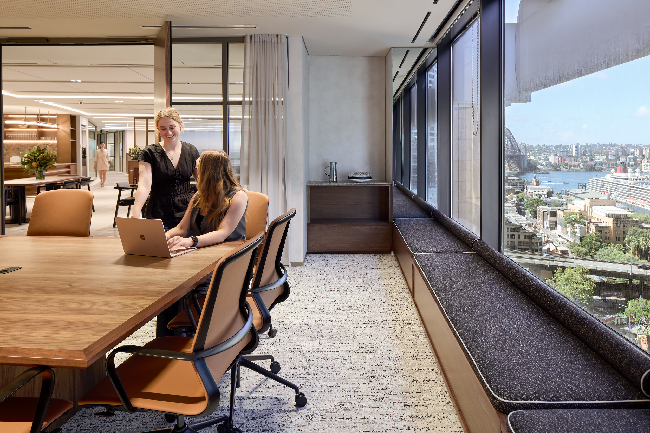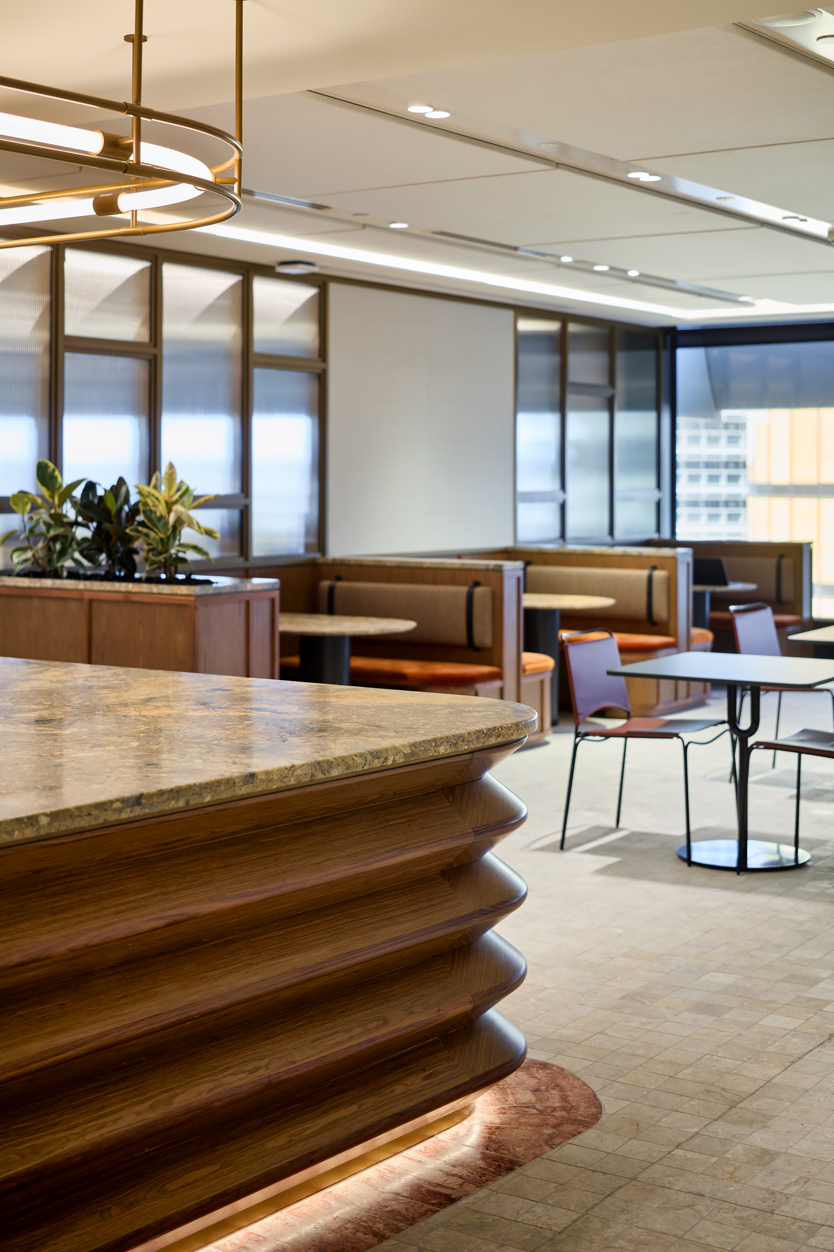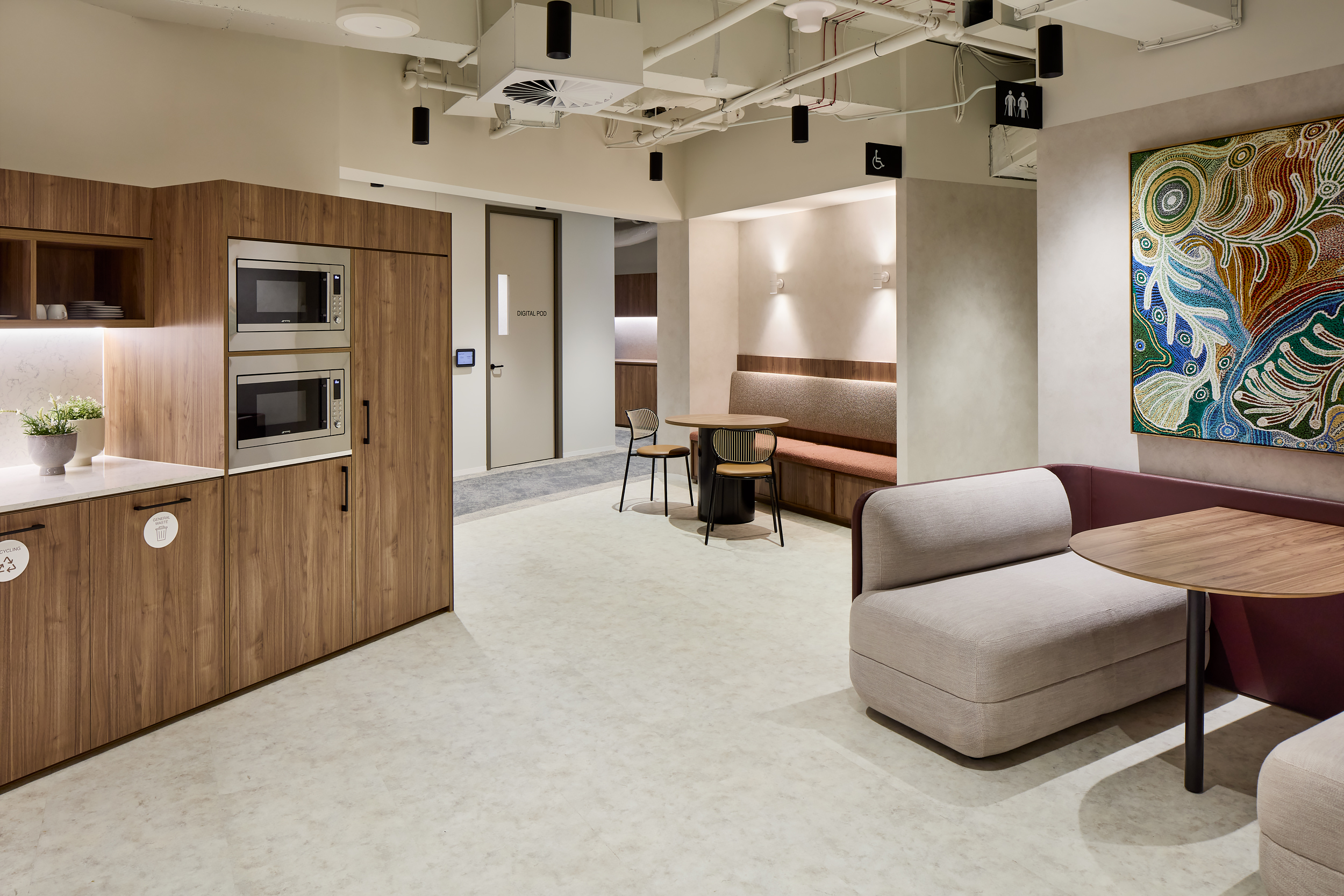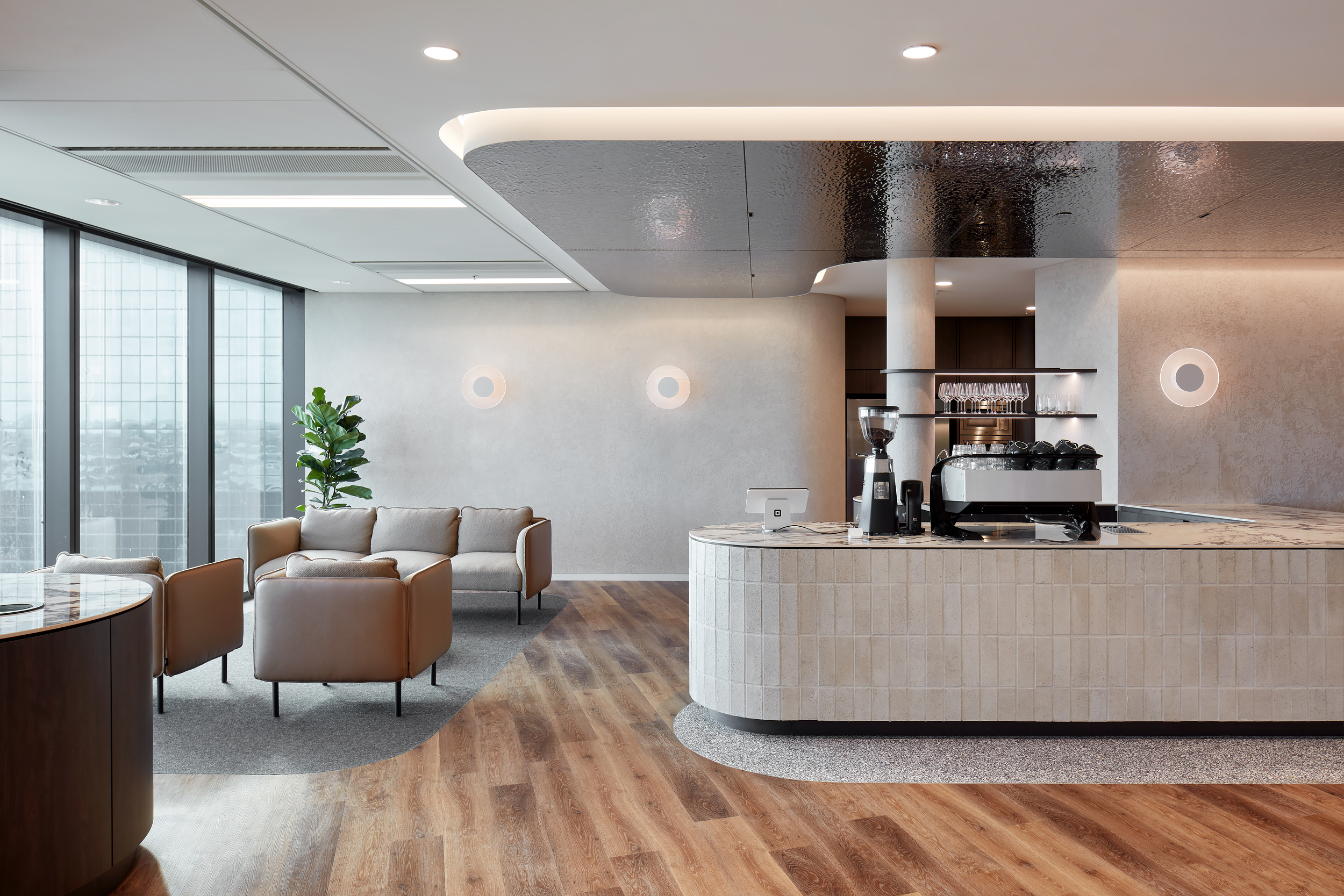 The fit-out spanned 16 spaces, including presentation and conference rooms, digital pods, private and executive meeting rooms, a waiting area and a cafe community lounge.